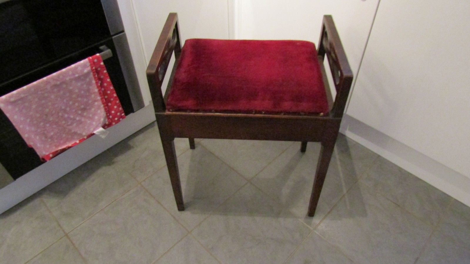 Title (ebay affiliate link): Vintage Oak ? Piano Stool ~ Lift up Lid for Music Storage and Side Handles