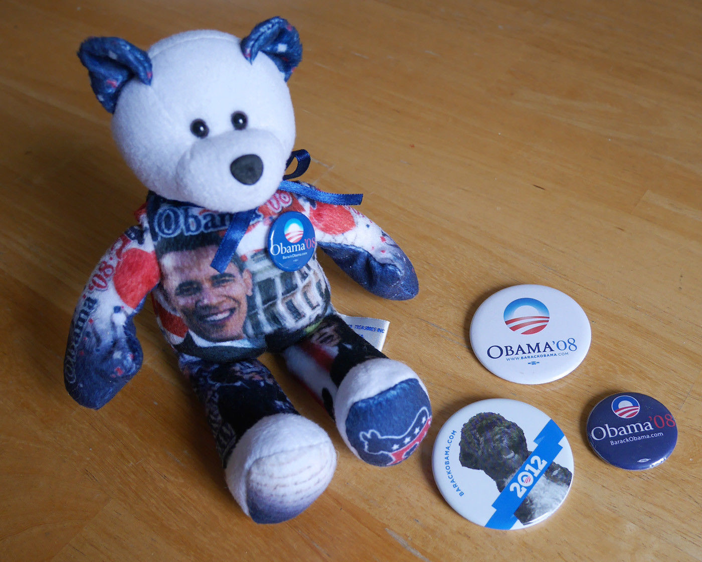 Title (ebay affiliate link): Obama election collectibles - small Beanie Baby-like bear and 4 campaign buttons