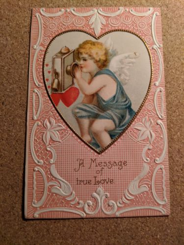Title (ebay affiliate link): Greeting vintage postcard. Valentine. Cupid in a heart. Pink & white embossed.