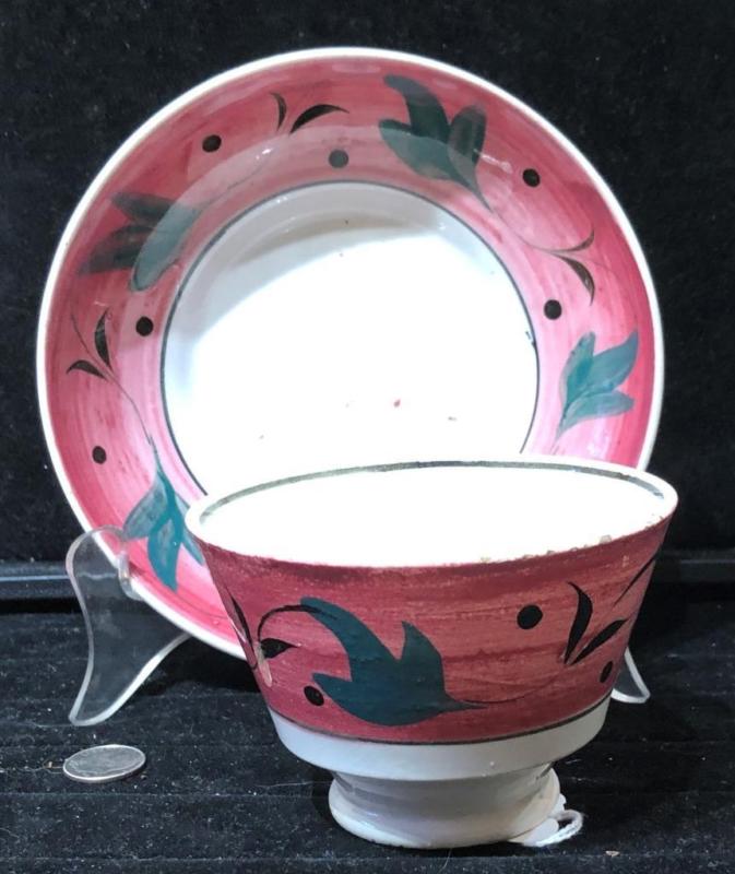 Title (ebay affiliate link): Antique Pink Hand-Painted Floral Decorated Pearlware Cup & Saucer, c. 1825
