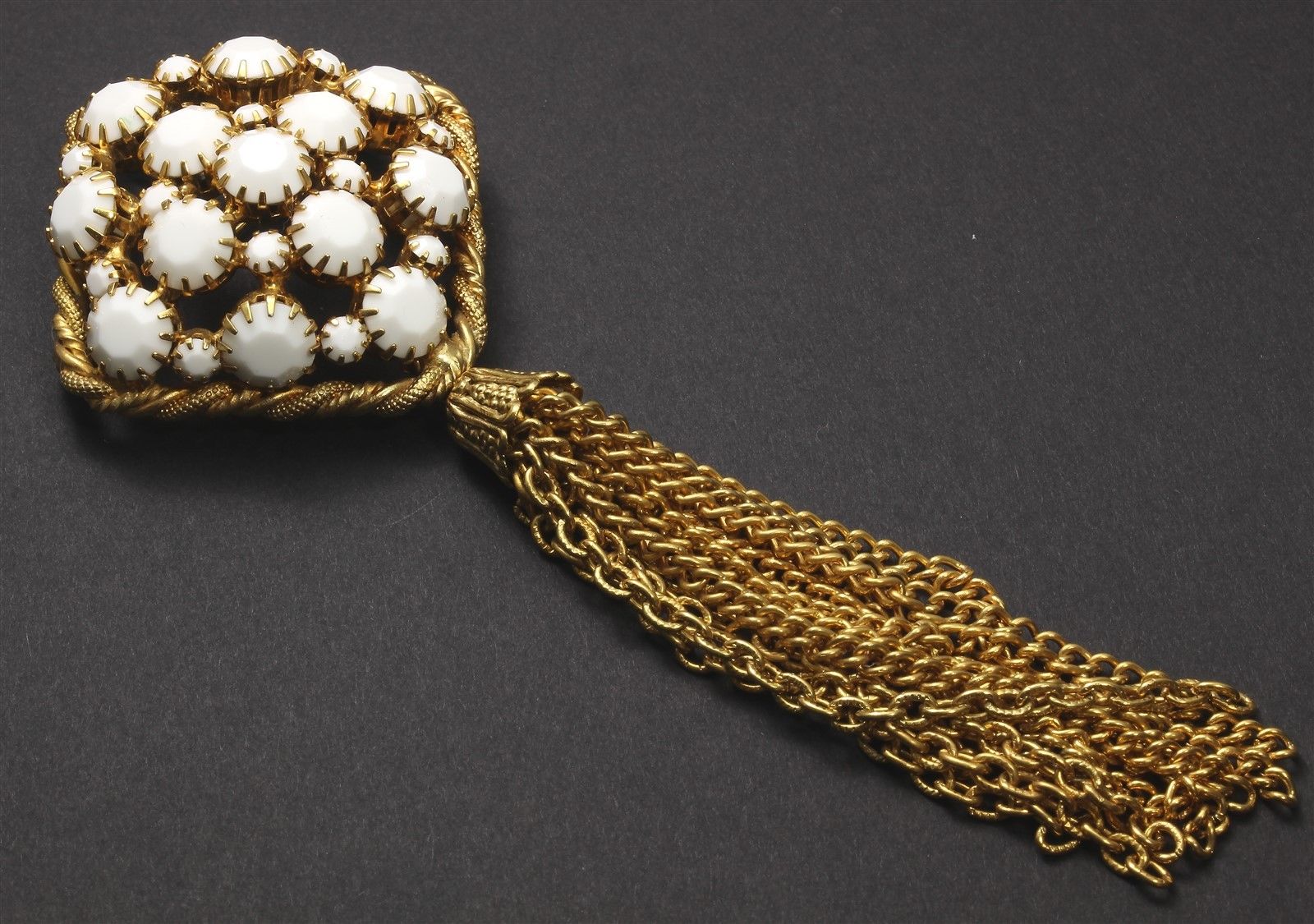 Vintage Ornate White Milk Glass Rhinestone Cluster Tassel Dangle Pendant Pin