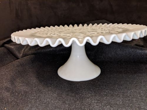Title (ebay affiliate link): VINAGE FENTON PEDESTAL CAKE PLATE SPANISH LACE SOLID MILK GLASS RUFFLED EDGE