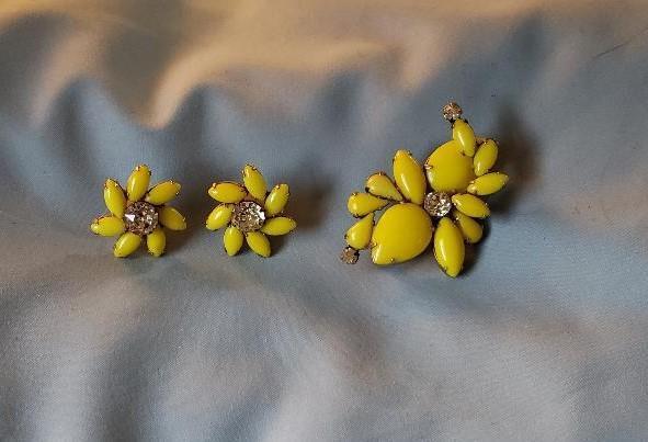 Title (ebay affiliate link): Vintage Yellow Milk Glass & Rhinestone Matched Set - Brooch & Earrings