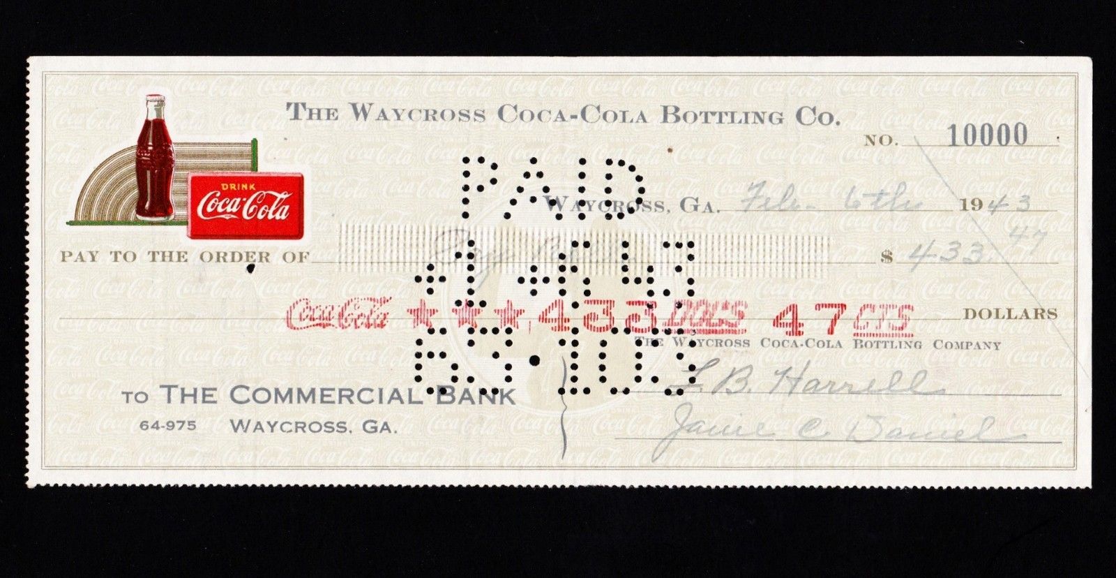 Coke Check 1943-Coca Cola Bottling Co of Waycross GA WWII 75 yrs old! $433.47