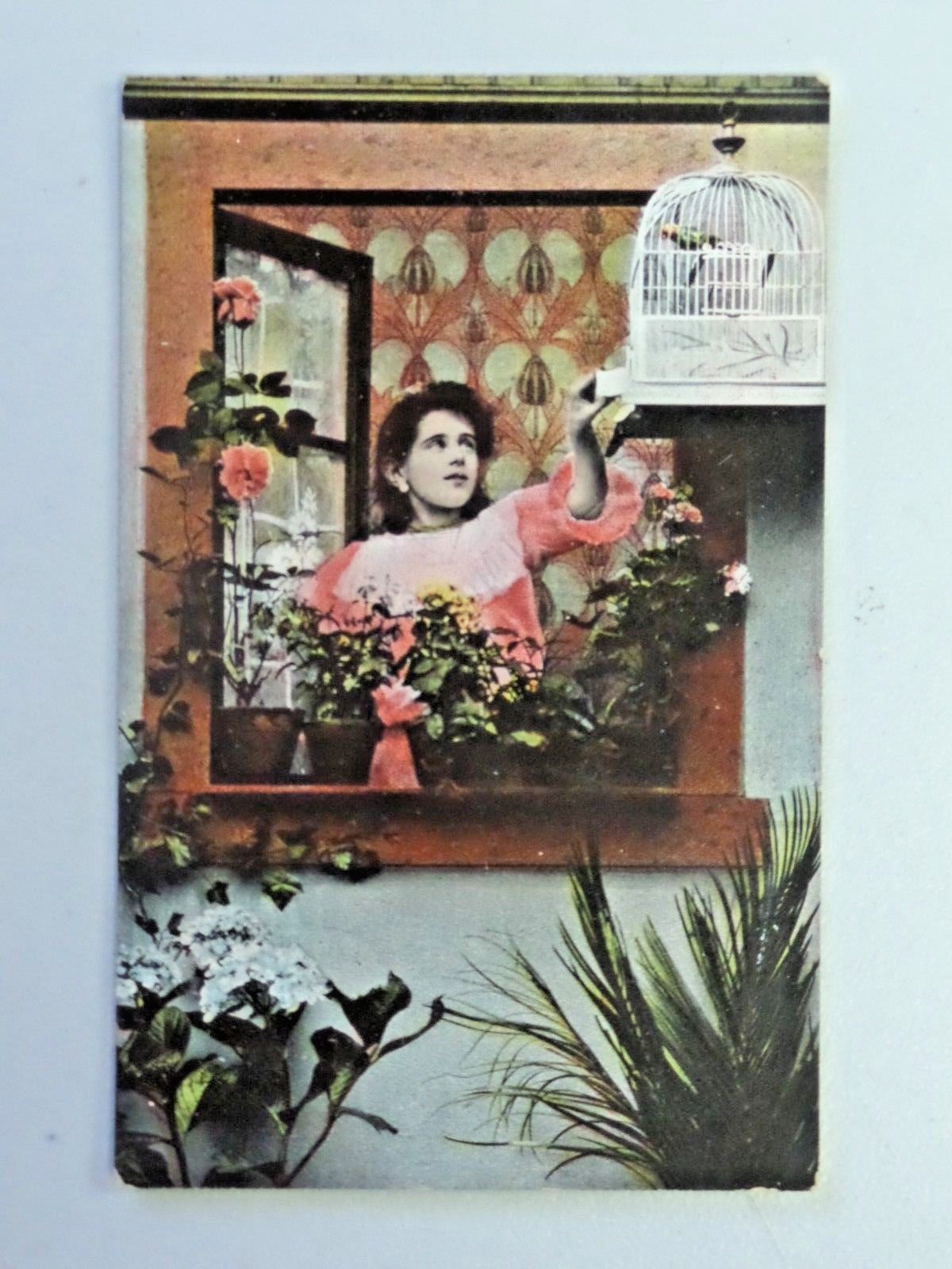 Title (ebay affiliate link): Vtg. Cutesy Postcard Little Girl with Bird in Bird Cage Unused 2764