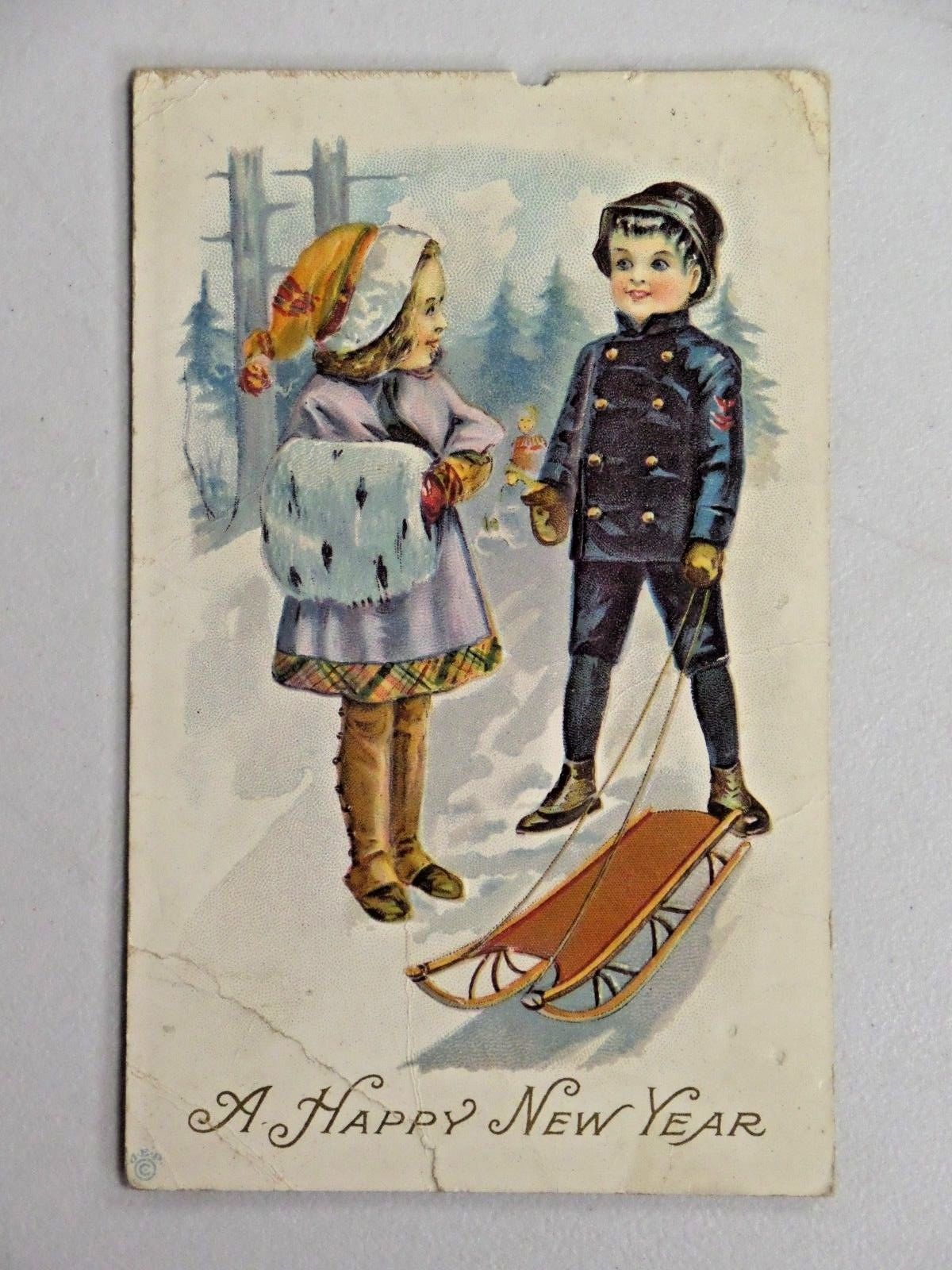 Title (ebay affiliate link): Vintage J.E.P. Embossed Postcard A Happy New Year Kids with Sled 1916 Post 3002