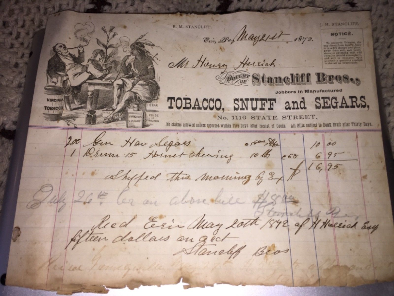 Title (ebay affiliate link): 1872 STANCLIFF BROTHERS TOBACCO,SNUFF & SEGARS INVOICE, 1116 STATE ST, ERIE,PA