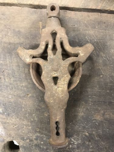 Title (ebay affiliate link): Antique Rustic Cast Iron Barn Trolley Drop Pulley Vintage Farm Decor Restore