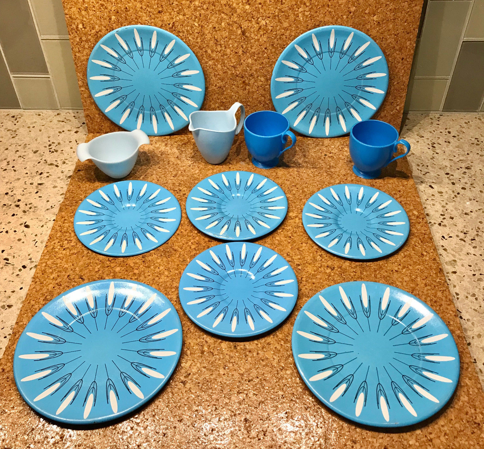 Title (ebay affiliate link): Mid Mod TURQUOISE WHEAT PATTERN Aluminum/Plastic TEA SET DISHES Gentle Use Wear