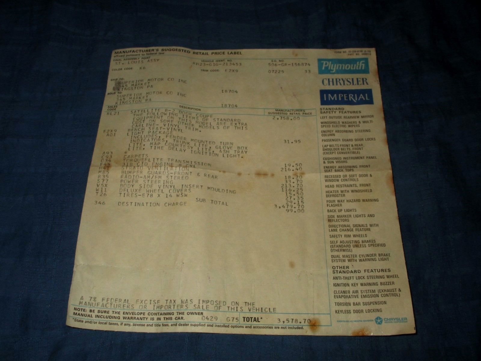 1970 Plymouth Satellite Manufacturer''s Suggested Retail Price Window Sticker