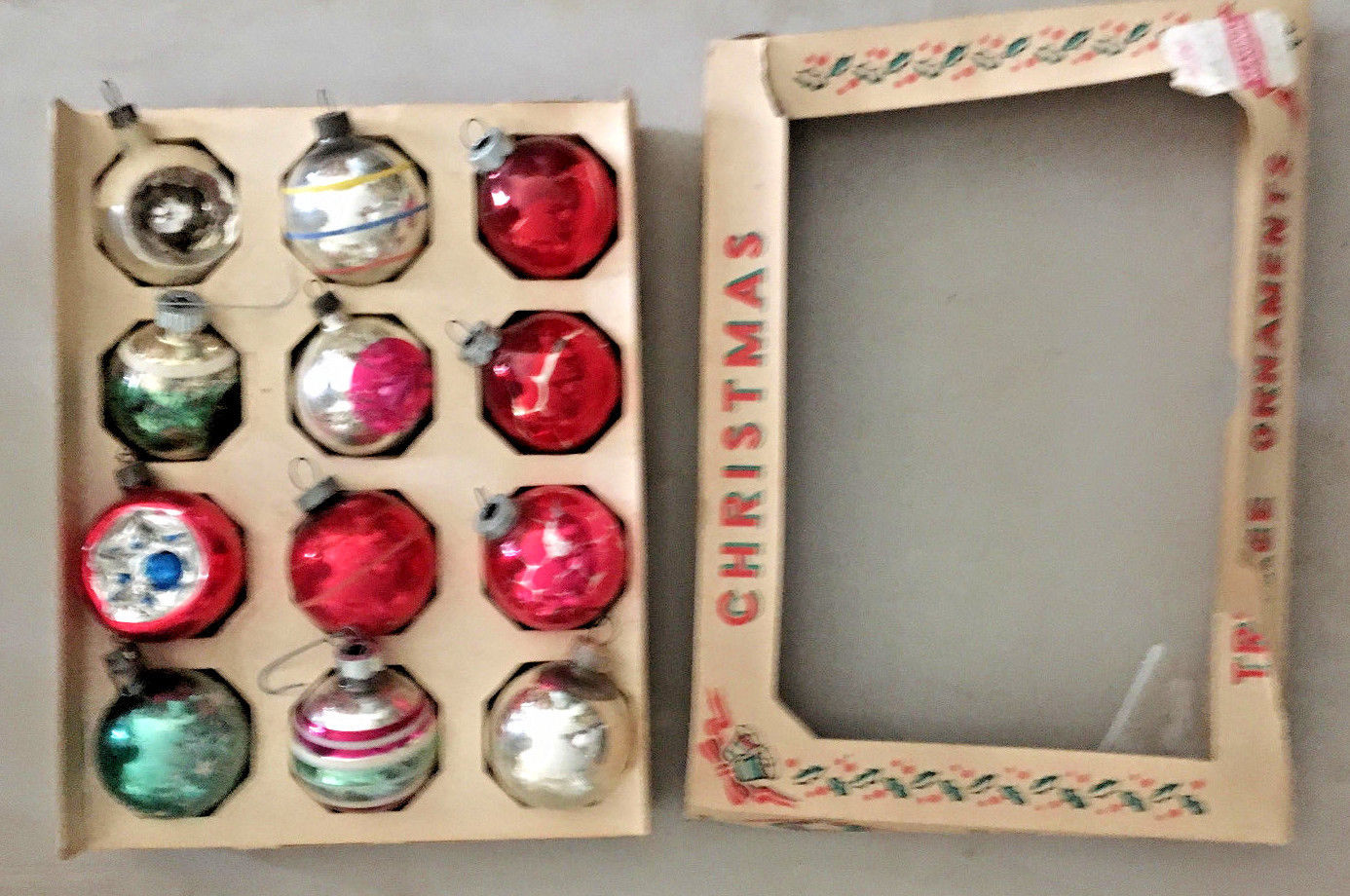 Vintage 12 mercury glass Christmas ball ornaments, small 45mm assorted ,box