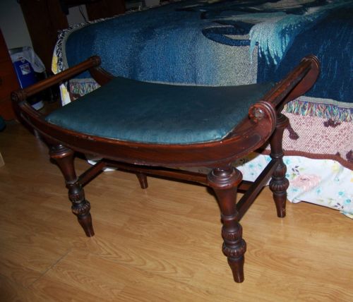 Title (ebay affiliate link): Vintage Antique Ornate Wooden Bench & Blue / Green Padded Seat Chair 32X21X14
