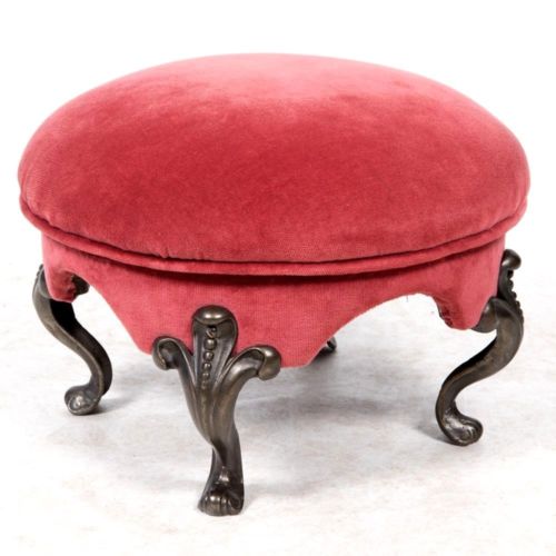 Antique 20th Century Round Cast Metal & Red Velvet Upholstered Foot Stool