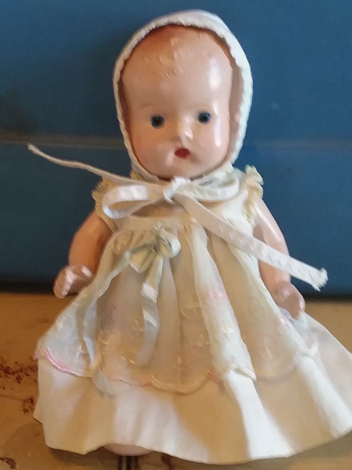 Title (ebay affiliate link): Antique Compostition Baby Doll unmarked cute outfit 9" tall