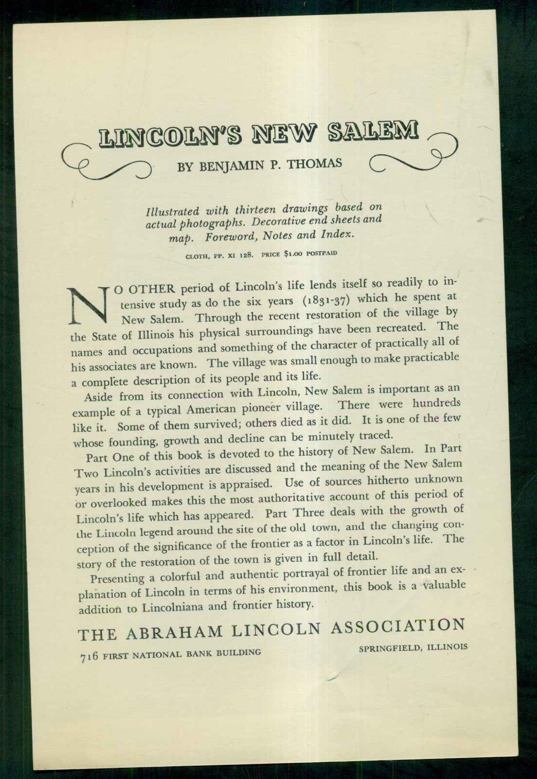 Title (ebay affiliate link): 1934 The Abraham Lincoln Assoc."Lincoln''s New Salem" by B. P. Thomas Promo Flyer