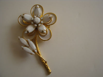 VINTAGE WHITE MILK GLASS & WHITE ENAMEL GT BROOCH PIN