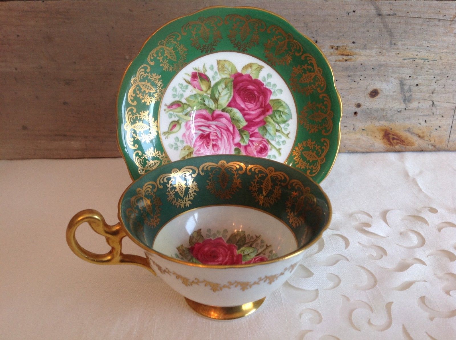 Title (ebay affiliate link): Vtg EB Foley bone china Footed Tea Cup & Saucer Green & gold trim, floral center