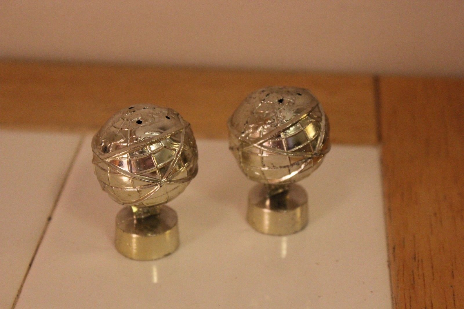 1964 NY Queens World''s Fair Metal Unisphere Globe Salt Pepper Shakers 18175