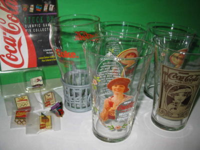 Title (ebay affiliate link): VINTAGE 5 COCA-COLA GLASSES w/6 OLYMPIC PINS, Holder