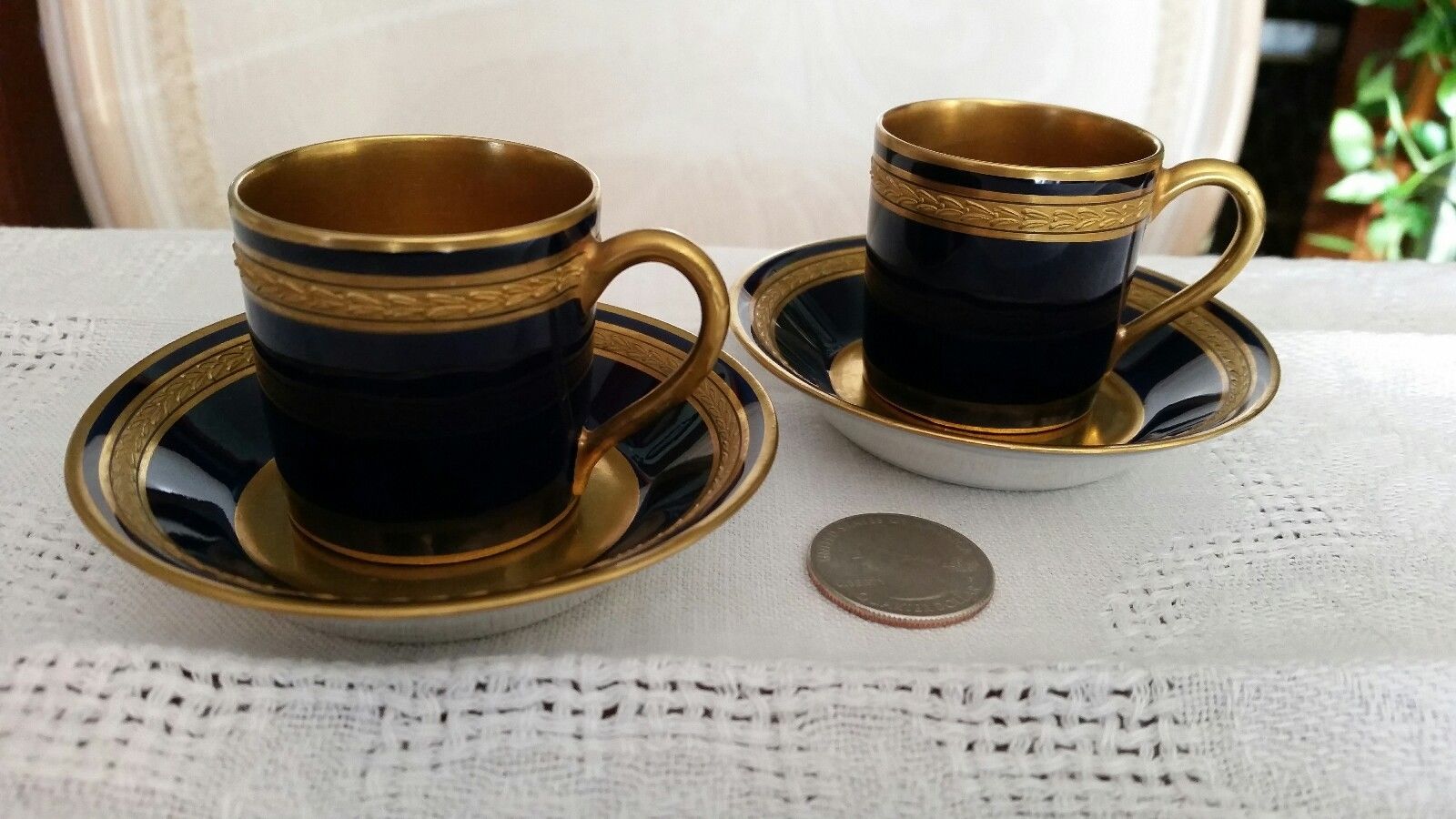 Title (ebay affiliate link): ~ Two Elegant French Demitasse Cup & Saucer ~ Raised Gold Gilt Cobalt Blue