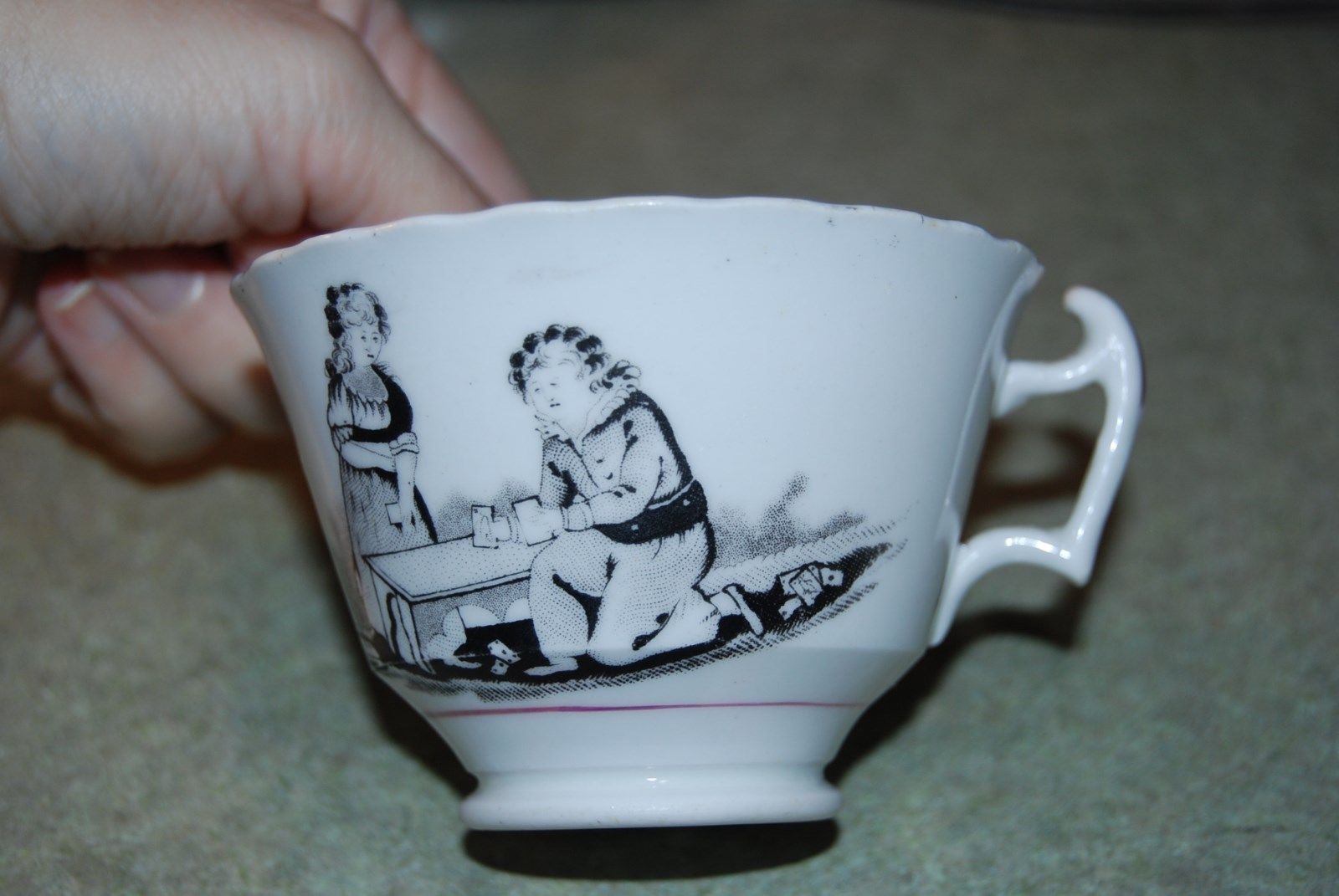 Title (ebay affiliate link): Antique Pink Luster Lustreware Porcelain Cup Black Transferware Children Cards
