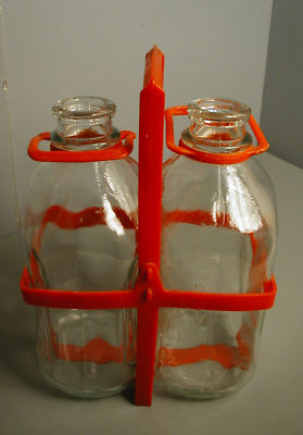 RED PLASTIC CARRIER & 2 HALF GALLON MILK GLASS BOTTLES