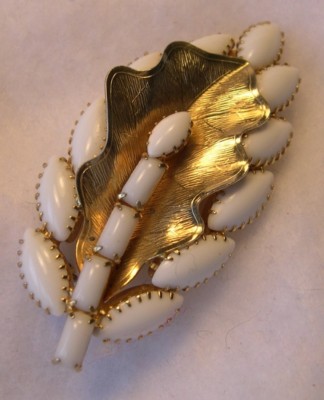 Lovely Weiss Milk Glass/Goldtone Leaf Brooch—Early Mark