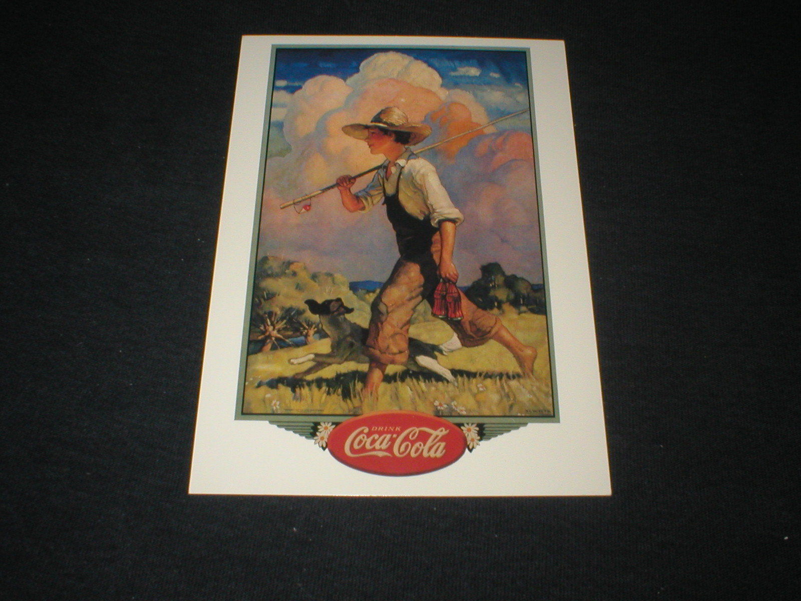 Title (ebay affiliate link): ARCHIVE COCA - COLA POSTCARD <> Boy Off On A Fishing Trip Summer View 1937 Art