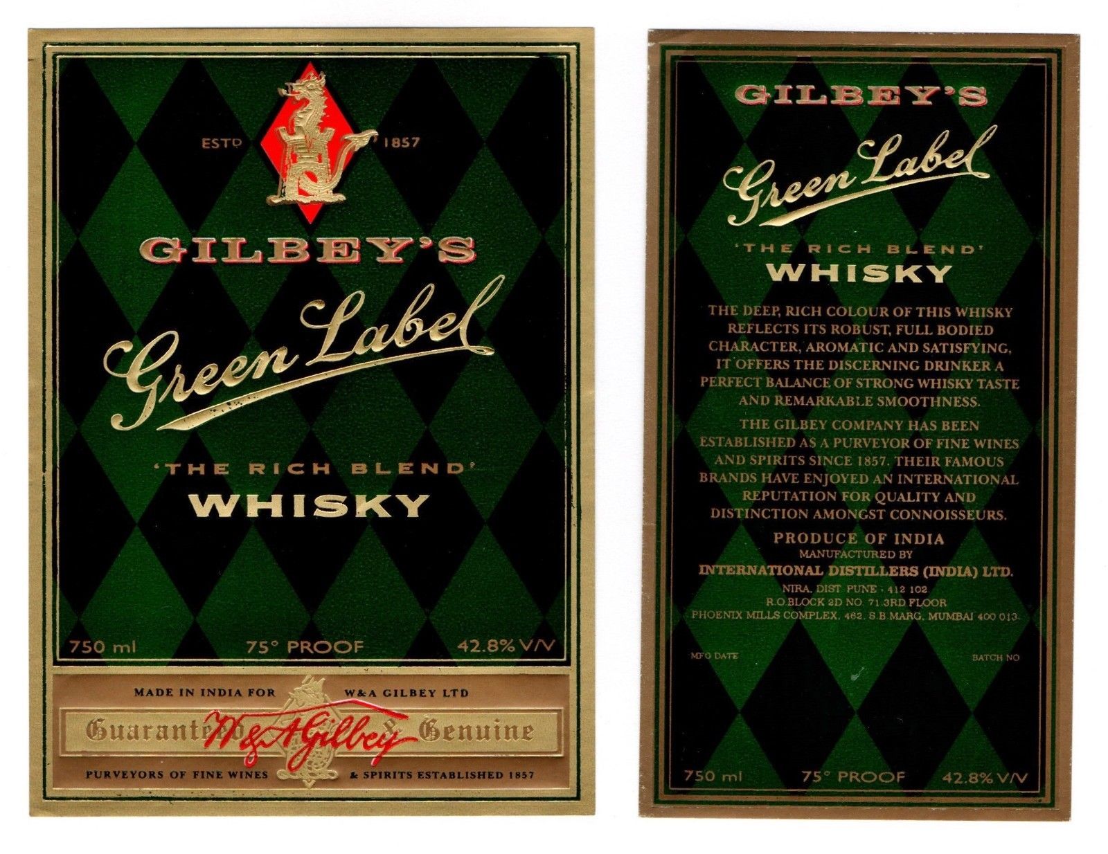 Gilbey''s Green Label Whisky label + back - Int. Distillers, India - see scan