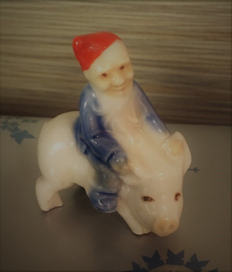 German Gnome Riding a Pig Figurine