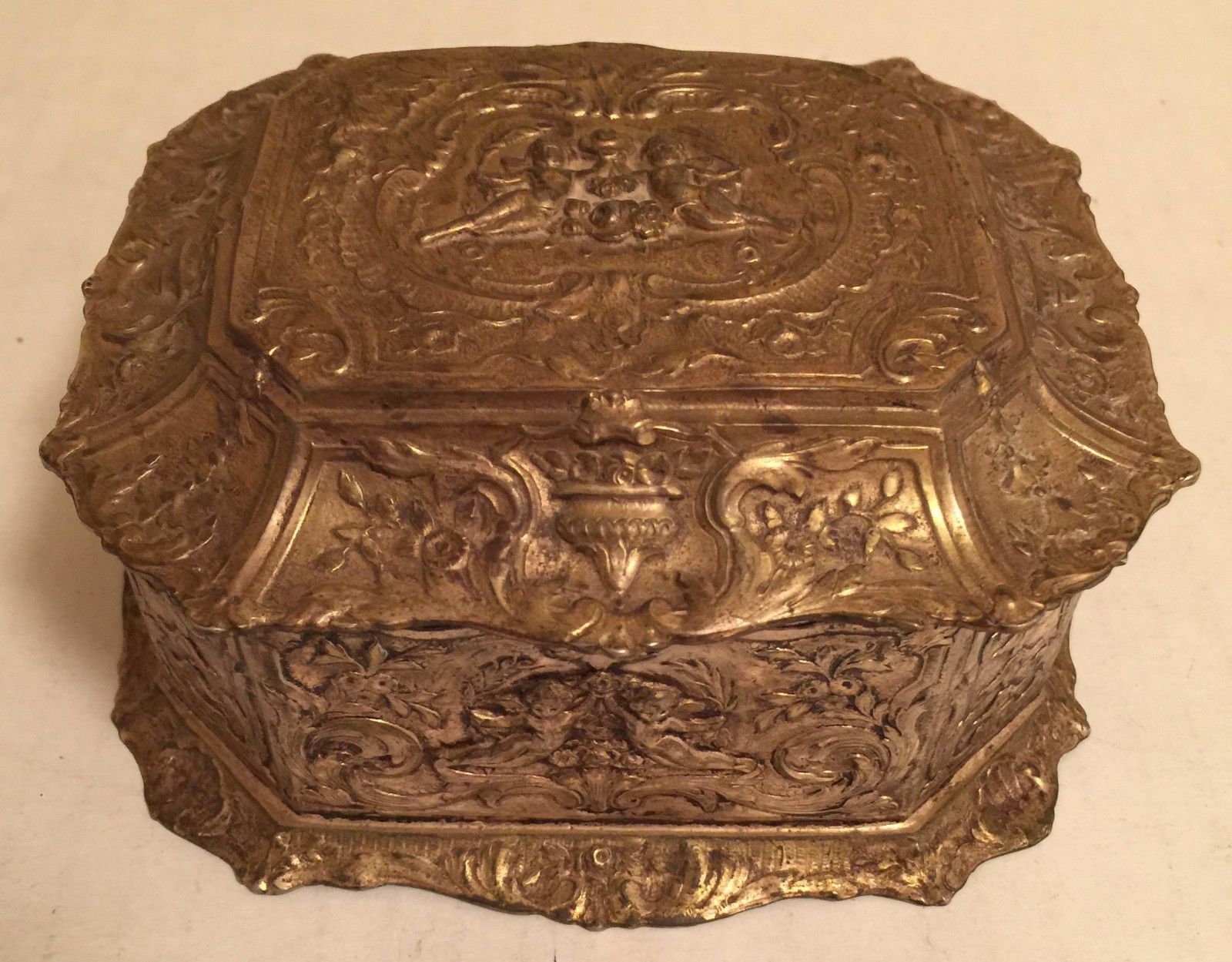 Title (ebay affiliate link): Antique Cherub Bronze, Brass or Coin Silver Jewelry Dresser Box With Hallmarks