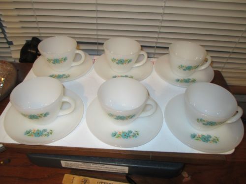 Title (ebay affiliate link): VTG. 12 PC. 6 CUPS & SAUCERS FIRE KING BLUE DAISY PATTERN WHITE MILK GLASS