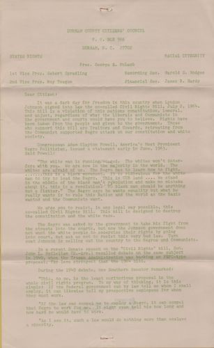 Vtg Letter BEVERLY LAKE 1960s GOVERNOR POLITICAL Durham NC Anti Civil Rights