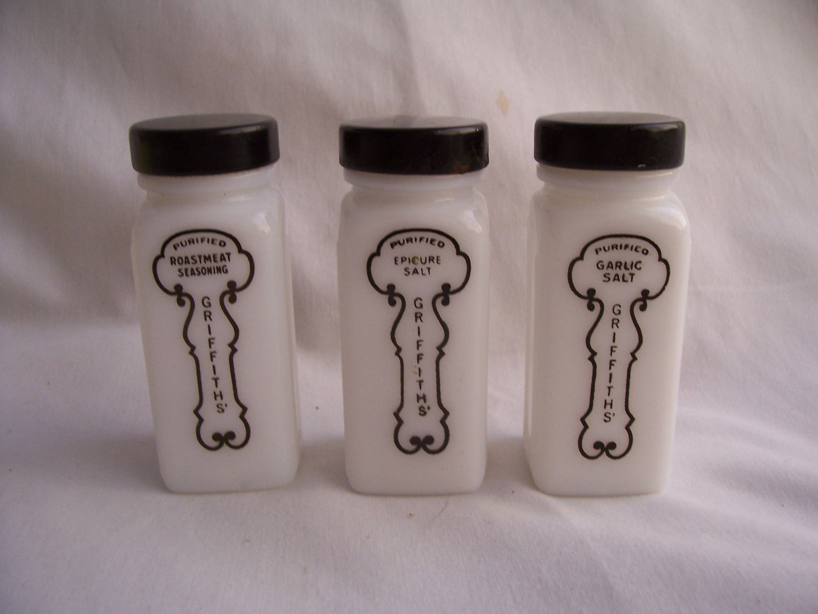 Title (ebay affiliate link): 3 Vintage Griffith''s Milk Glass Spice Jars w/Black Tops