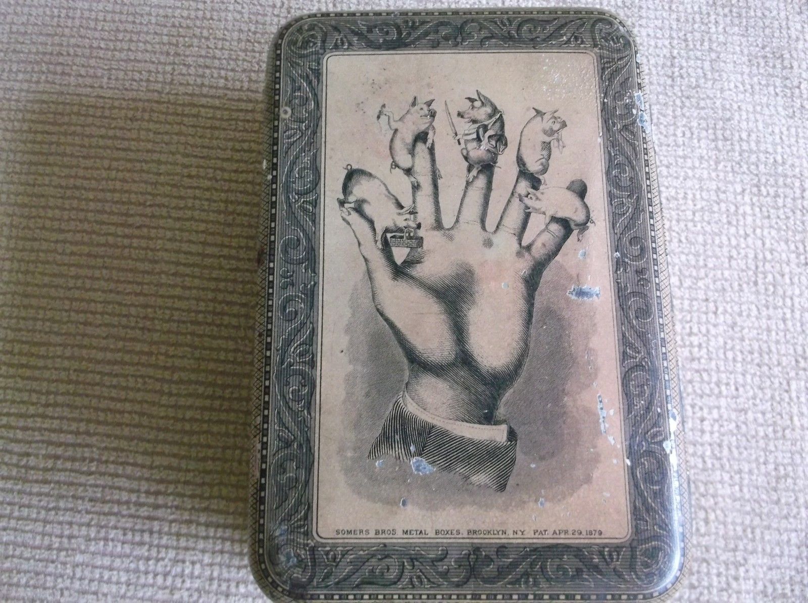 antique tin advertising box, Somers Bros, a pig on each finger!...