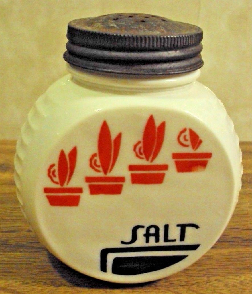 Title (ebay affiliate link): VINTAGE FIRE-KING MILK GLASS SALT SHAKER RED FLOWER POT RIBBED SIDES 4" LOOK