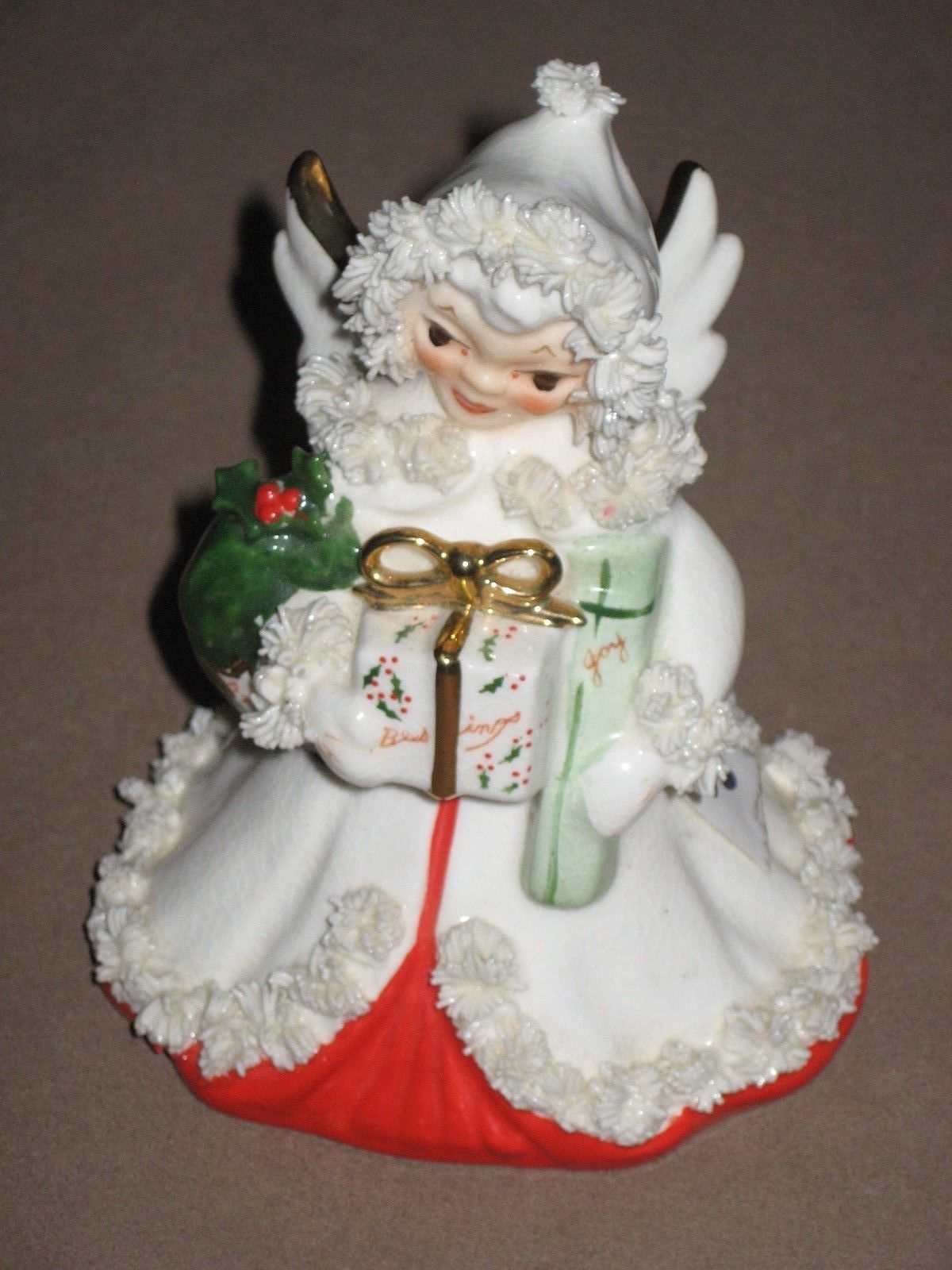Title (ebay affiliate link): Vtg NAPCO Christmas Blessings JOY Winter White Snow Angel Shopper Girl S116B