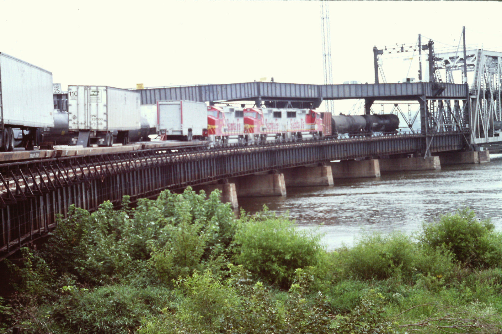 Santa Fe AT&SF Fort Madison IA Sep 1990 Kodachrome railroad slide bridge RR EMD