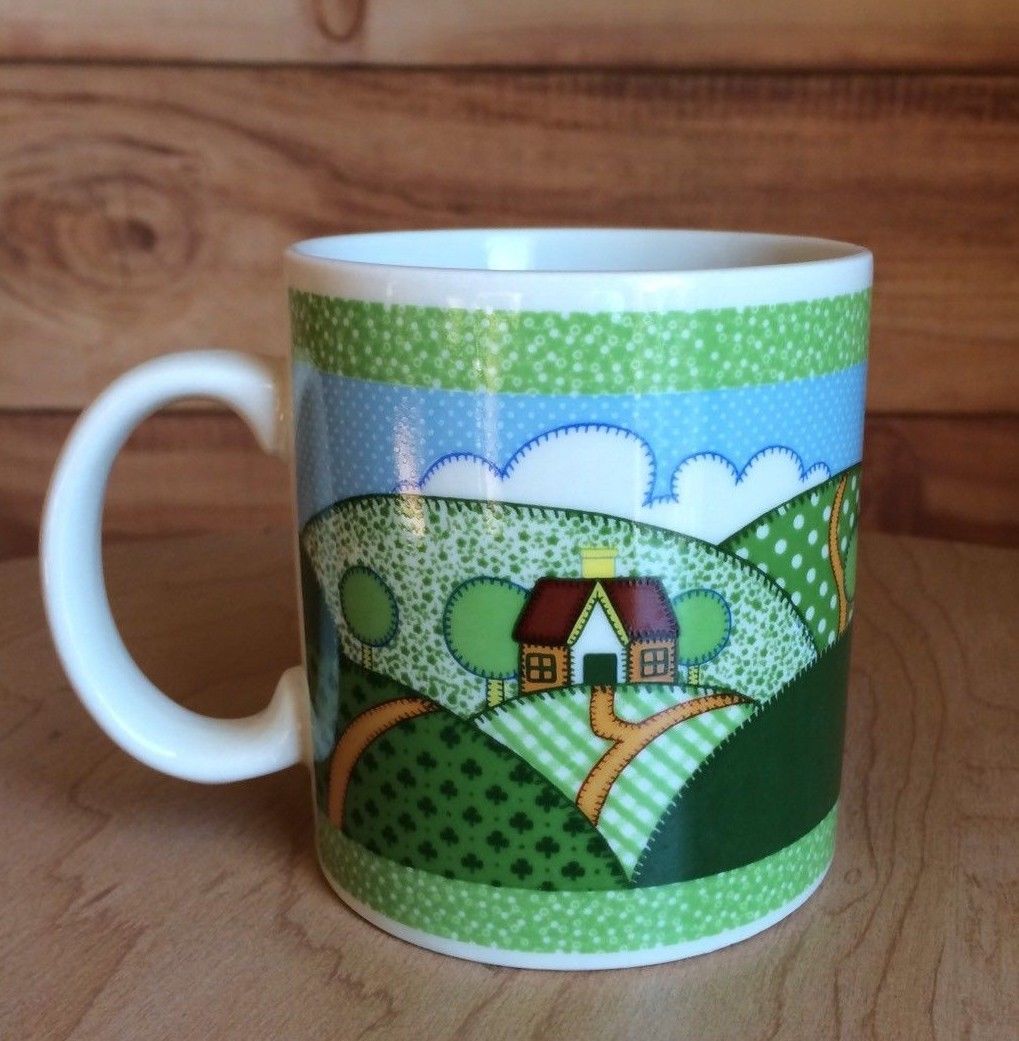 Title (ebay affiliate link): Otagiri Patchwork Coffee Cup mug japan little houses green mug 3 3/4 inch tall
