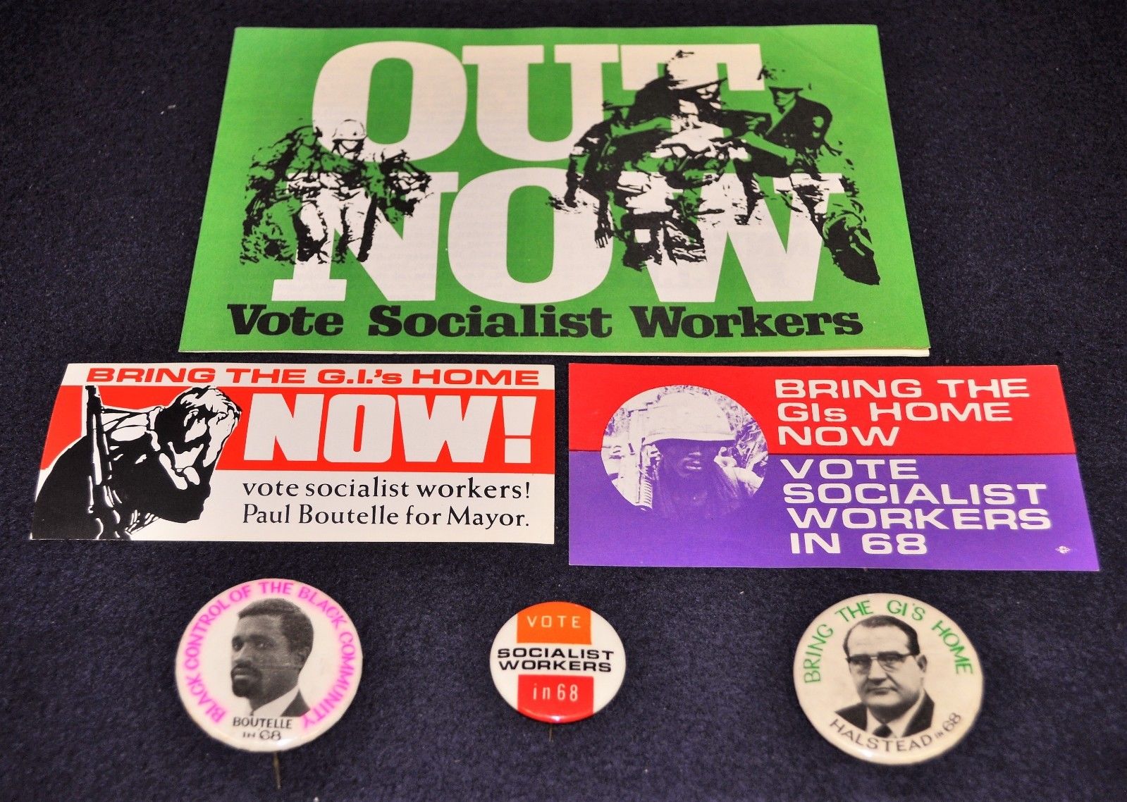 Title (ebay affiliate link): 3 Vintage 1968 SWP Anti-Vietnam War Political Cause Pinback Buttons 2 Fliers