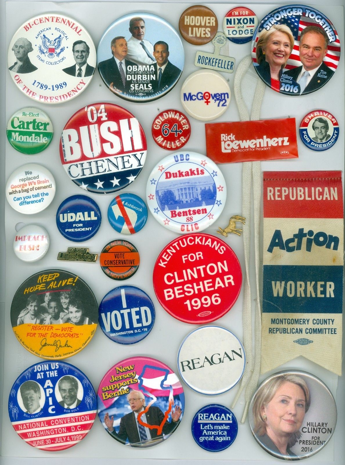 Title (ebay affiliate link): 24 Vintage Presidential Political Campaign Pinback Buttons 2 Lapel Pins 1 Ribbon