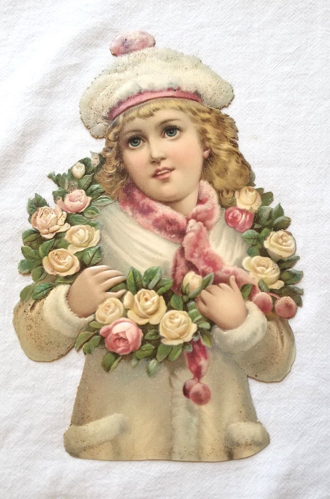 Title (ebay affiliate link): Victorian Girl, with Rose Wreath around her Shoulders. Late 1890s German Scrap