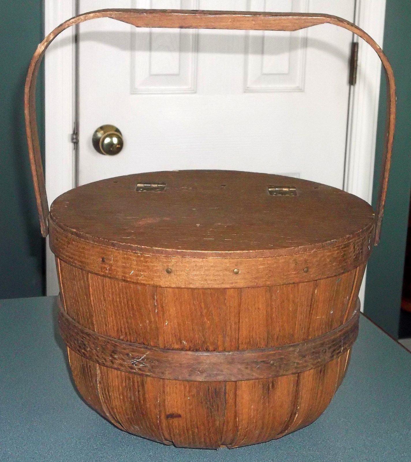 Title (ebay affiliate link): Vintage Primitive Round Wooden Shaker Basket Hinged Lid Handle