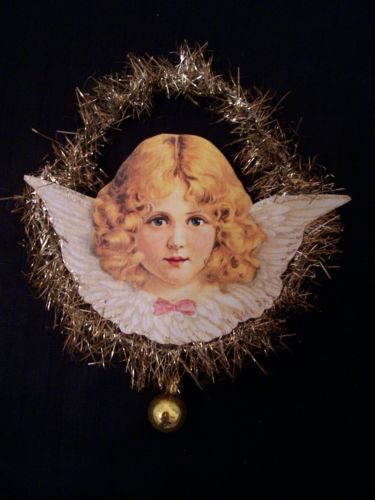 Antique Look Christmas Ornament, ANGEL/Face/WINGS, Scrap, Glass, Tinsel,Handmade