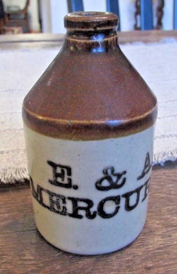 Title (ebay affiliate link): Antique Mini E & A Mercury Apothecary Crock Bottle Brown & White