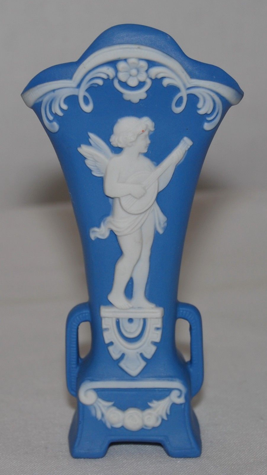 Title (ebay affiliate link): SCHAFER & VATER BISQUE PORCELAIN BUD VASE BLUE WHITE WINGED TROUBADOUR GERMANY