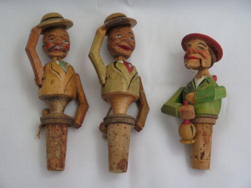 Group of 3 Vintage German Carved & Painted Wooden Bottle Stoppers