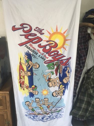 Title (ebay affiliate link): Pep Boys Manny, Moe & Jack Beach Towel, The Boys On The Lake, Very Colorful