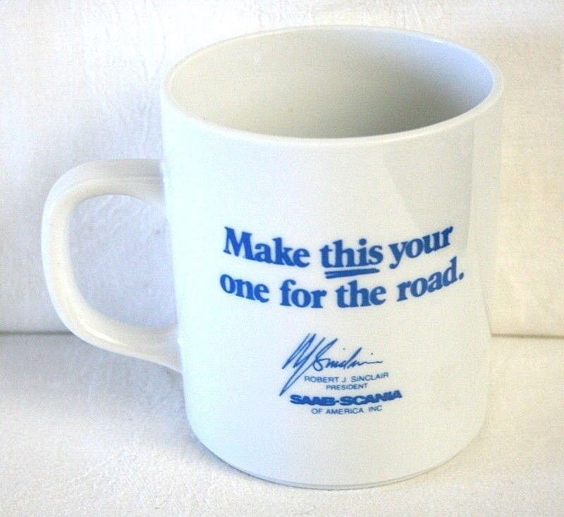 Title (ebay affiliate link): Vintage SAAB Coffee Mug - Make this your one for the road. Signed by Sinclair