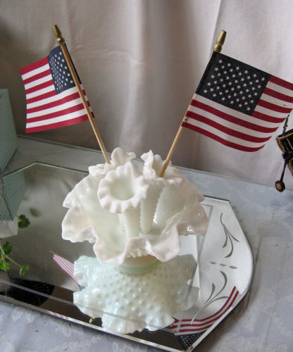 Title (ebay affiliate link): Antique Fenton Hob Nail 3-Horn Lily Epergne Milk Glass Flower Vase Opalescent